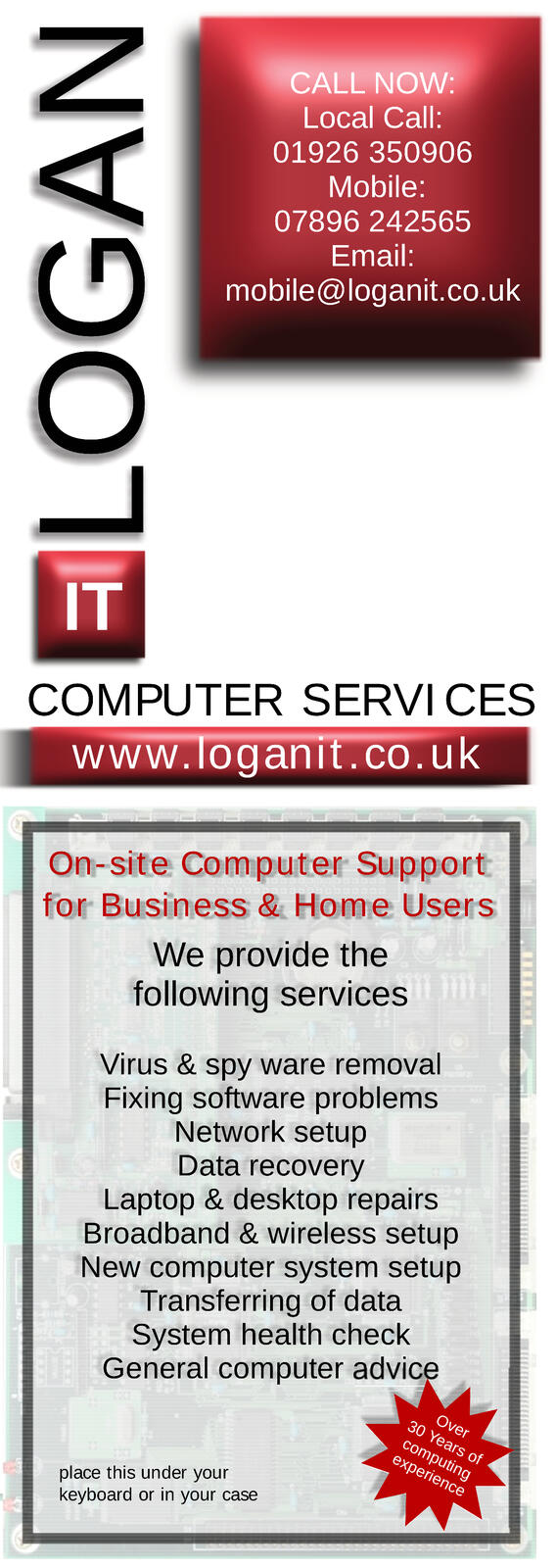 Onsite computer repair support maintenance virus removal and installations in Warwick , Leamington , Stratford upon Avon , Coventry , Henley in Arden , Balsall Common , Claverdon , Southam , Wellesbourne , Kineton and Warwickshire . Telephone – 01926 350906 . Mobile – 07896 242565 . Email mobile@loganit.co.uk